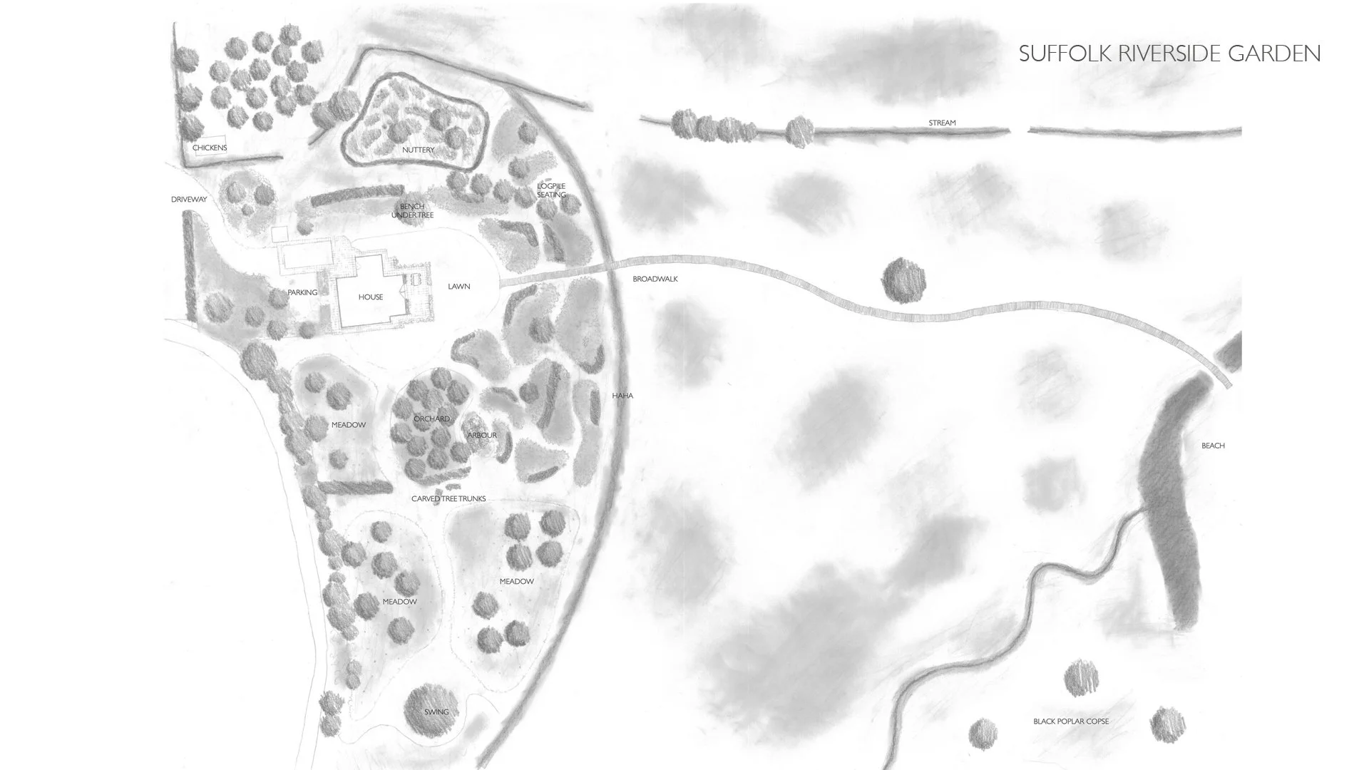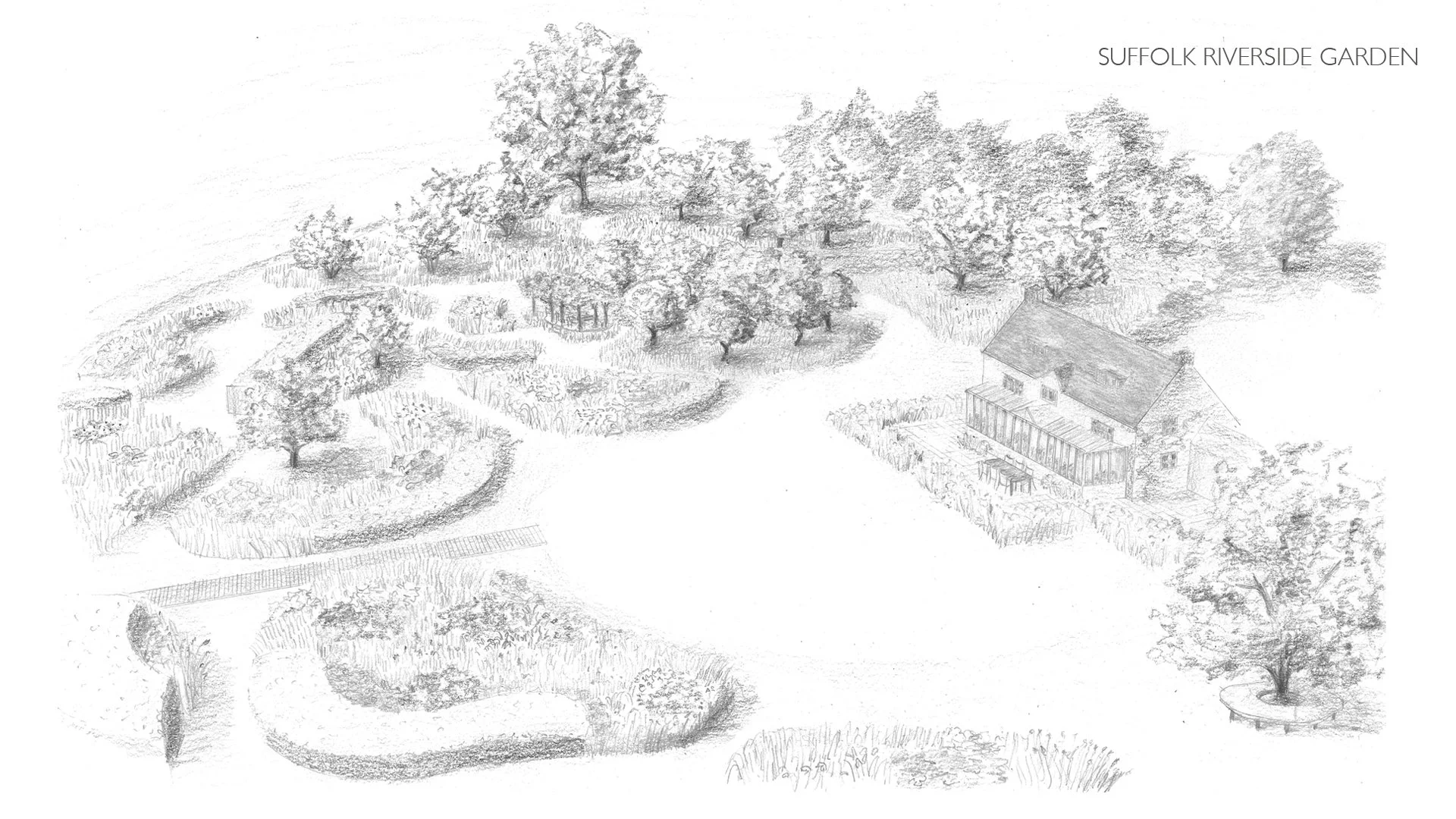 Planting is loose and naturalistic with a mix of native and non-native perennials used to ensure pollinators are catered for as long as possible. Large areas of meadow provide habitats for insects and food for birds. A large vegetable patch, orchard and nuttery are key features providing home grown deliciousness. A mix of perennials and grasses are used in the main planting beds which will seemingly bleed out into the riverside landscape where reeds and grasses grow in the wild.